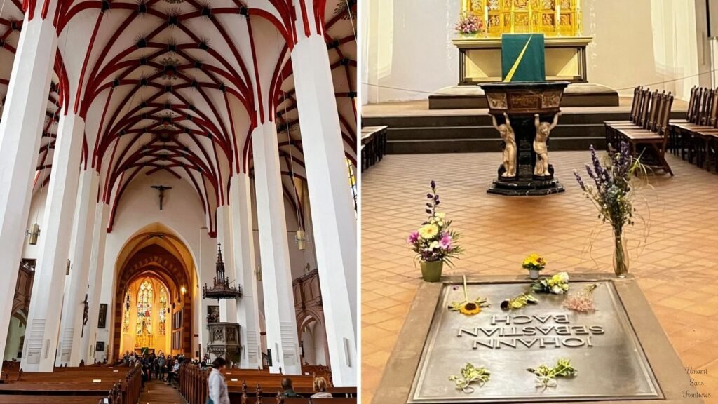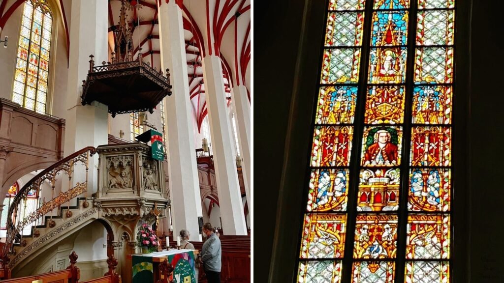 Inside the church, your eyes are immediately drawn to the beautiful rib-vaulted ceiling and colorful stained-glass windows. Near the altar lies Bach’s tomb, always surrounded by fresh flowers. When we visited, we happened to arrive during an organ rehearsal — the solemn sound filling the church was absolutely moving.