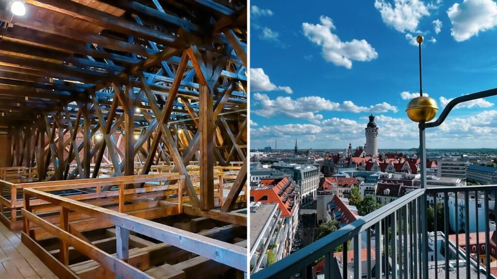 Along the way, you can see the intricate wooden beams supporting the roof — like a maze of craftsmanship from another era. At the top, a peaceful panorama of red rooftops and quiet streets unfolds below.